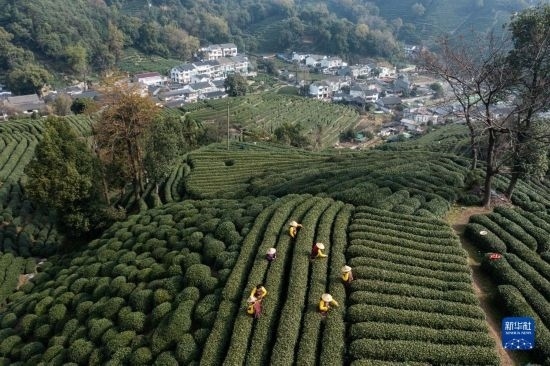 3月13日,梅家塢村的茶農(nóng)在采摘西湖龍井“明前茶”(無人機(jī)照片)。