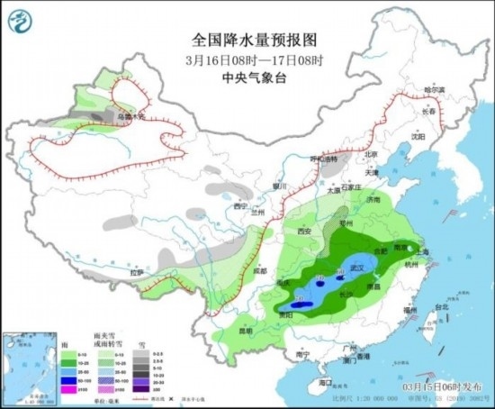 3月16日08時至17日08時,新疆沿天山地區(qū)、西藏東部、山西北部、川西高原北部等地部分地區(qū)有小到中雪。黃淮西部、江淮西部和南部、江漢大部、江南北部和西部、西南地區(qū)東南部等地部分地區(qū)有中到大雨,其中,湖南北部和西部、貴州中東部等地部分地區(qū)有暴雨(50~70毫米),并伴有短時雷暴大風(fēng)、冰雹等強(qiáng)對流天氣。