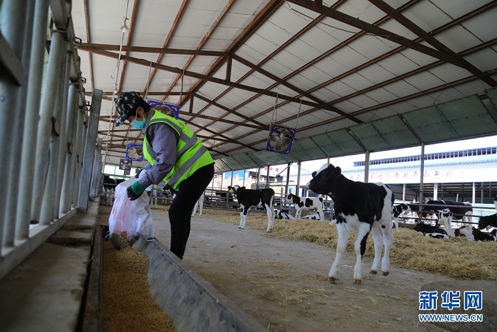 小黑山奶牛養(yǎng)殖專(zhuān)業(yè)合作社的工人在牛棚里給牛添加飼料。新華網(wǎng)發(fā)(白敖敏 攝)