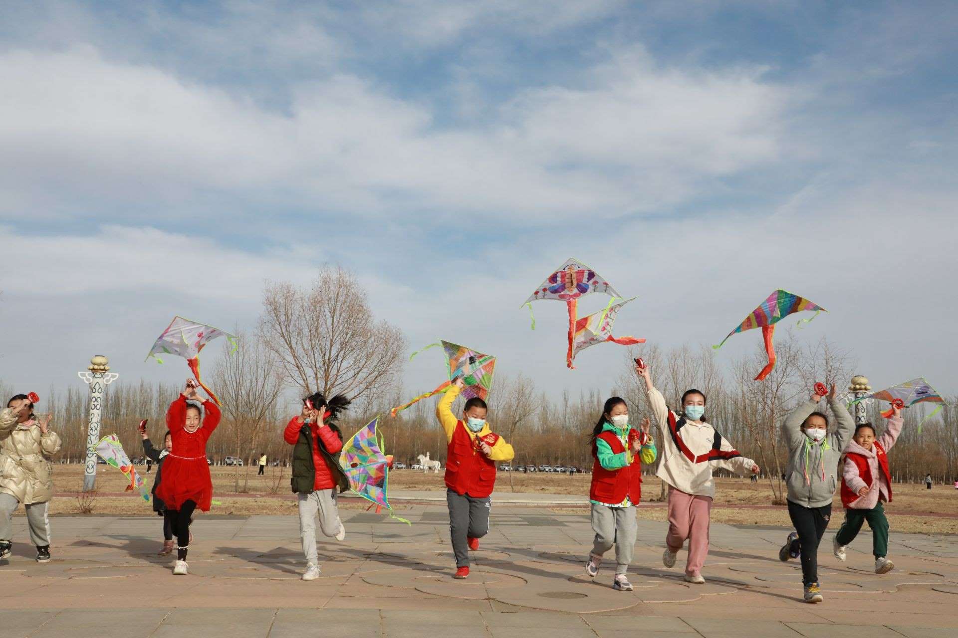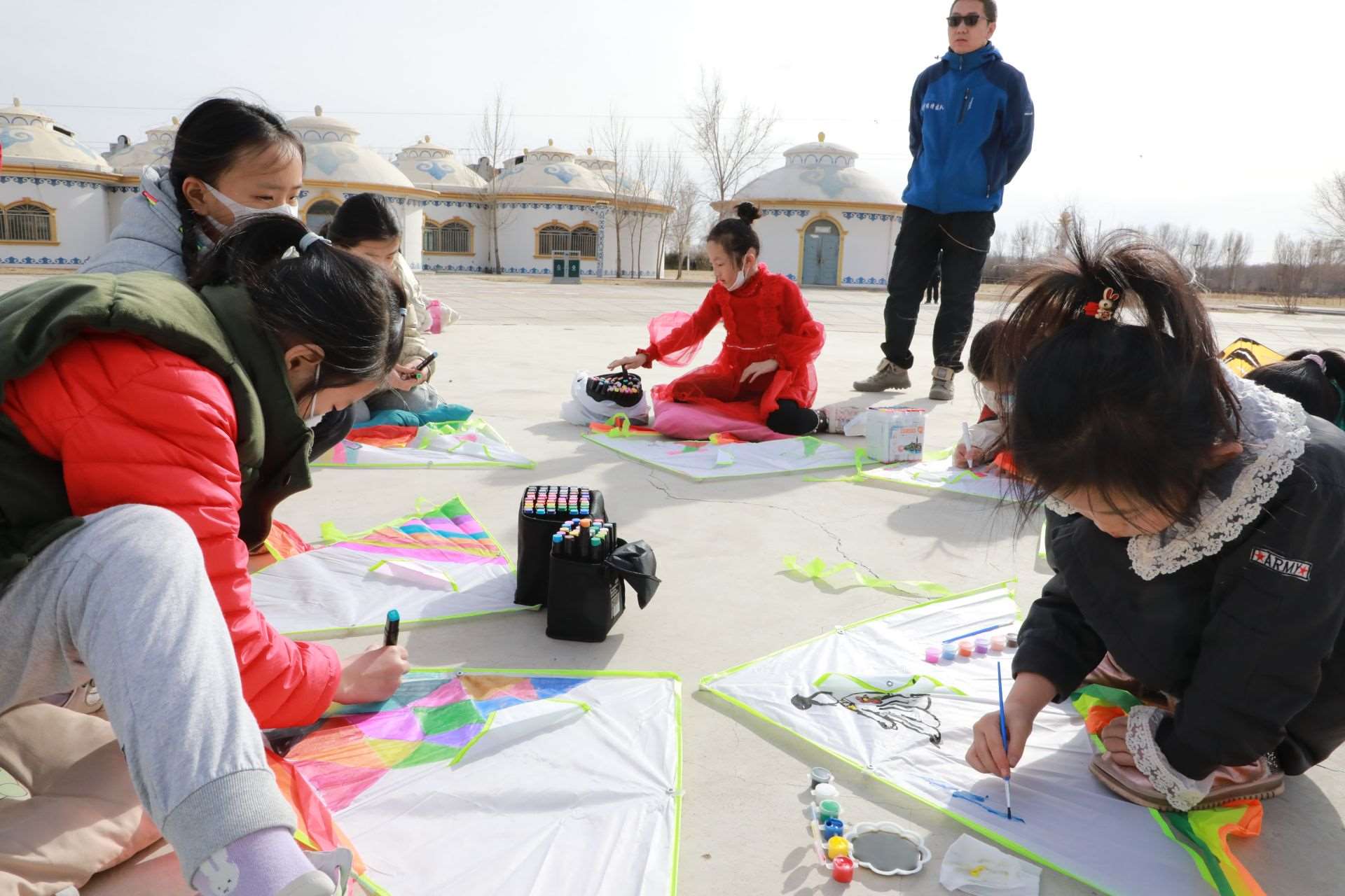 活動現(xiàn)場,呼和浩特市風(fēng)箏協(xié)會還特地準(zhǔn)備了20個空白風(fēng)箏,讓孩子們充分發(fā)揮想象力,動手繪制自己喜歡的圖案。沐浴著溫暖的春光,小記者們拿出事先準(zhǔn)備好的水彩筆或者顏料,或趴或坐,認(rèn)真構(gòu)思,有的在風(fēng)箏上畫上了粉色的郁金香,有的畫上了振翅飛舞的蝴蝶,有的畫上了美麗的白雪公主,還有的涂鴉上喜歡的色塊,他們用五彩斑斕的顏色點綴創(chuàng)意,裝點自己喜歡的風(fēng)箏。一個小時的功夫,一個個獨具創(chuàng)意的風(fēng)箏在小記者們的巧手繪制中完成了。在郝偉老師的指導(dǎo)下,小記者們把風(fēng)箏安裝好,接上線,舉行了一場小型風(fēng)箏比賽?!巴郏晒α?,起飛了!”只見數(shù)十只色彩各異的風(fēng)箏隨風(fēng)飛上天空,你爭我趕,越飛越高,小記者們?nèi)滩蛔“l(fā)出歡呼聲,臉上洋溢著開心地笑容。