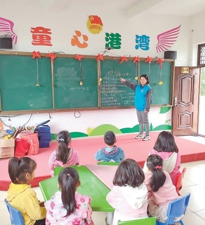 有著十幾年幼兒教育經(jīng)驗的劉蓮娟,就這樣被村里推薦為童伴媽媽。同時,她還是螺溪鎮(zhèn)一家幼兒園的老師,住在鎮(zhèn)里。每到周末,她便騎上電動自行車,往返于村鎮(zhèn)之間,每周在“童心港灣”開展10多個小時的親情連線、閱讀陪伴、文體項目、家訪校訪等活動。