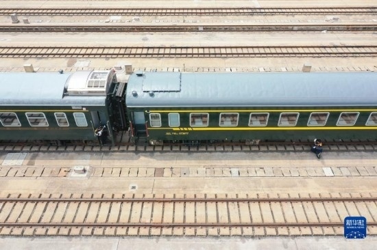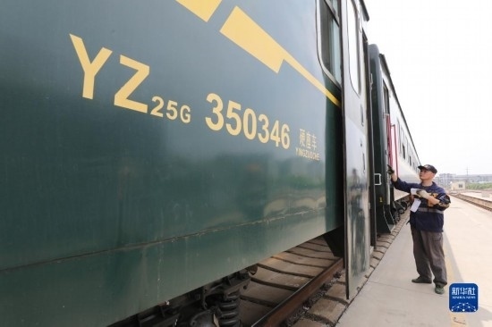 4月28日,中國(guó)鐵路上海局集團(tuán)有限公司徐州站的鐵路連結(jié)員在對(duì)臨時(shí)旅客列車進(jìn)行拉風(fēng)作業(yè)(無人機(jī)照片)。