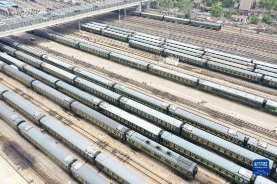 4月28日拍攝的中國(guó)鐵路上海局集團(tuán)有限公司徐州站客車整備場(chǎng)內(nèi)的臨時(shí)旅客列車(無人機(jī)照片)。