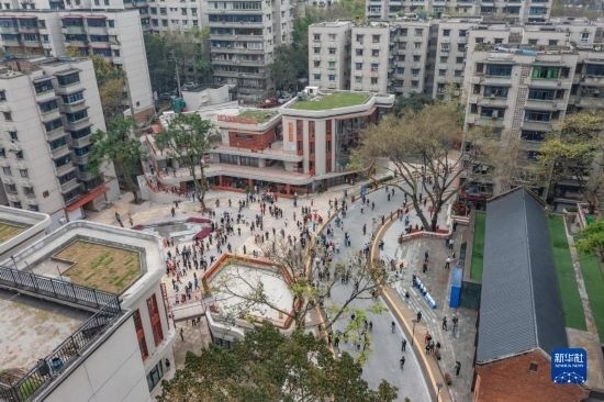 4月28日,在竣工亮相的重慶市九龍坡區(qū)謝家灣街道民主村片區(qū)城市更新項(xiàng)目(一期),人們?cè)谝惶幑部臻g休息(無(wú)人機(jī)照片)。