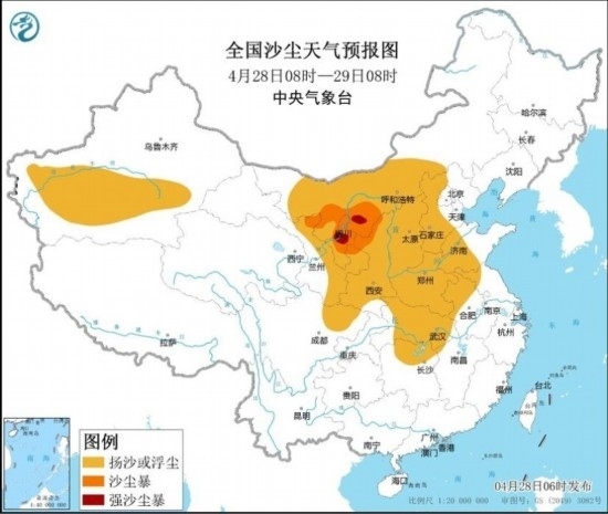 受冷空氣大風(fēng)影響,預(yù)計(jì)4月28日08時(shí)至29日08時(shí),新疆南部、內(nèi)蒙古中西部、甘肅北部和東部、寧夏、陜西、四川盆地北部、山西、河北西部、河南、山東中西部、湖北、湖南北部、安徽北部、江蘇西北部等地的部分地區(qū)有揚(yáng)沙或浮塵天氣,其中,內(nèi)蒙古西南部、甘肅東北部、寧夏中北部、陜西西北部等地的部分地區(qū)有沙塵暴,局地有強(qiáng)沙塵暴。中央氣象臺4月28日06時(shí)發(fā)布沙塵暴藍(lán)色預(yù)警。