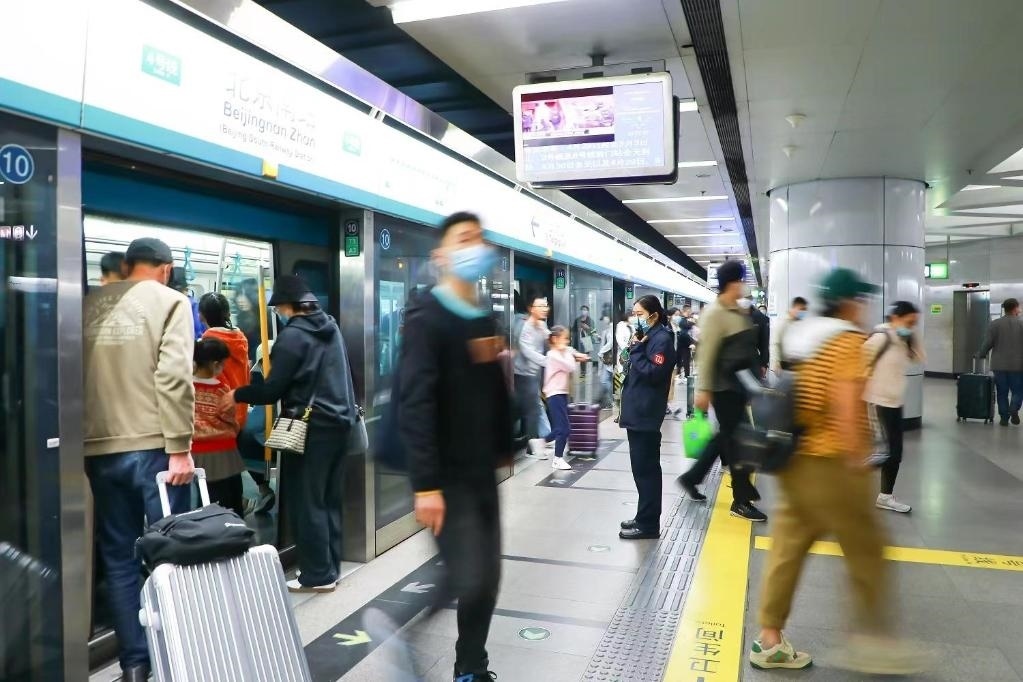 “大家進站時要小心腳下的行李箱?!?日14時,隨著大量鐵路旅客抵達北京南站,地鐵4號線北京南站也開始變得忙碌。站廳內,工作人員在自動售票機、閘機前引導旅客快速購票進站;站臺上,軌道列車準時抵達,乘客快速流動疏散。