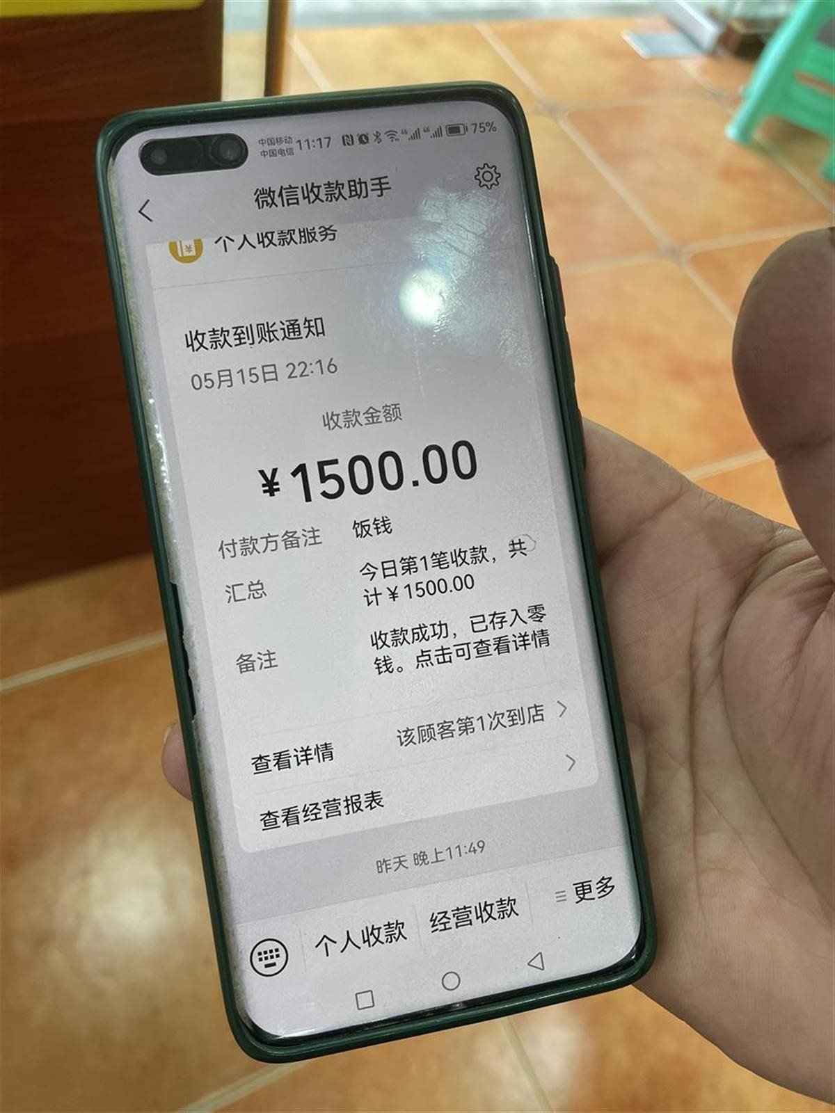 肖先生出示的收款記錄顯示,5月15日22點(diǎn)16分,收到飯錢(qián)1500元。