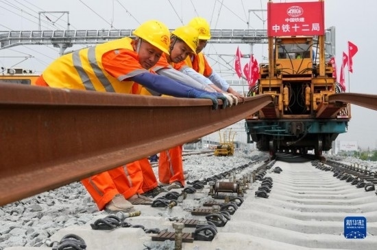 5月20日,在滬寧沿江高鐵太倉站施工現(xiàn)場(chǎng),中鐵十二局的工程人員準(zhǔn)備進(jìn)行螺栓緊固作業(yè),將對(duì)接好的鋼軌固定。