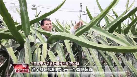 隆安火龍果種植技術(shù)員 何業(yè)昕:高溫來(lái)的時(shí)候,我們的火龍果雖然說(shuō)也能開花能結(jié)果,但是商品性非常的差。這個(gè)就是我們做出來(lái)一個(gè)微噴裝置。在夏季高溫的時(shí)候,我們通過(guò)一個(gè)噴水,一個(gè)霧化的噴水出來(lái)之后,達(dá)到整個(gè)園子全部降溫,降到5度到8度左右。