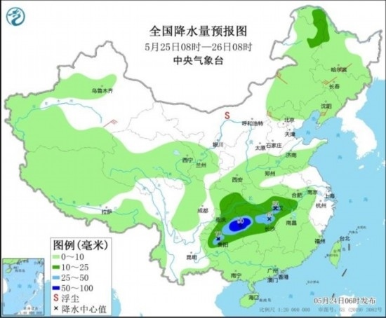 全國(guó)降水量預(yù)報(bào)圖(5月25日08時(shí)-26日08時(shí))
