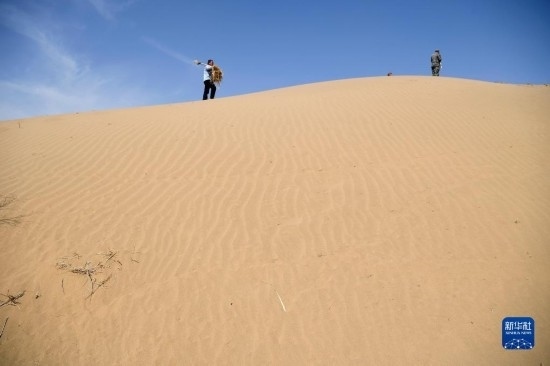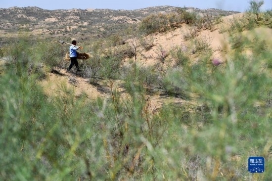 工作人員在白芨灘國家級(jí)自然保護(hù)區(qū)補(bǔ)扎草方格(6月7日攝)。