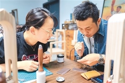 作為今年上海市為民辦實事項目“社會大美育課堂”的重要組成部分,今年上海市民藝術夜校春季班共開設教學點位123個、課程278門、招收學員6507人。夜校學習內(nèi)容包括傳統(tǒng)文化、時尚文化、非遺技藝、江南文化以及區(qū)域文化等。圖為5月8日,上海市寶山區(qū)淞南鎮(zhèn)社區(qū)文化活動中心,老師(右)正在指導學生皮具制作技巧。王 初攝(人民圖片)