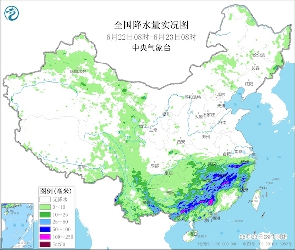 22日,南方地區(qū)普遍被雨水籠罩,浙江、福建、江西、湖南、廣西、廣東及云南東部的部分地區(qū)出現(xiàn)大到暴雨,廣西貴港、廣東清遠局地降雨量甚至達到200毫米至244毫米。