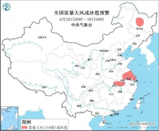 中央氣象臺(tái)6月29日06時(shí)繼續(xù)發(fā)布暴雨藍(lán)色預(yù)警和強(qiáng)對(duì)流天氣黃色預(yù)警:預(yù)計(jì),6月29日08時(shí)至30日08時(shí),黃淮南部、江淮、江漢中南部、江南北部、重慶東部以及黑龍江北部、內(nèi)蒙古東北部等地部分地區(qū)有大到暴雨,其中,湖北東部等地局地有大暴雨(100~150毫米)。上述部分地區(qū)伴有短時(shí)強(qiáng)降水(最大小時(shí)降雨量30~50毫米,局地可超過(guò)70毫米),黑龍江中部、安徽中南部、江蘇中南部、上海西北部、湖北東部等地的部分地區(qū)將有8~10級(jí)雷暴大風(fēng)或冰雹天氣,局地風(fēng)力11級(jí),江蘇中南部局地可能伴有龍卷(見(jiàn)圖1和圖2)。強(qiáng)對(duì)流的主要影響時(shí)段為今天午后至夜間。