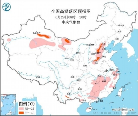 中央氣象臺(tái)6月29日06時(shí)繼續(xù)發(fā)布高溫黃色預(yù)警:預(yù)計(jì)6月29日白天,北京、天津、河北中南部、河南北部、山東西部、湖南東部、江西、浙江中北部、福建北部、廣西西部和東北部、廣東西北部以及內(nèi)蒙古西北部、新疆東部、甘肅河西等地的部分地區(qū)有35~37℃高溫天氣,其中,河北中南部、河南北部、新疆吐魯番盆地等地局地最高氣溫可達(dá)38~39℃(見(jiàn)圖3)。