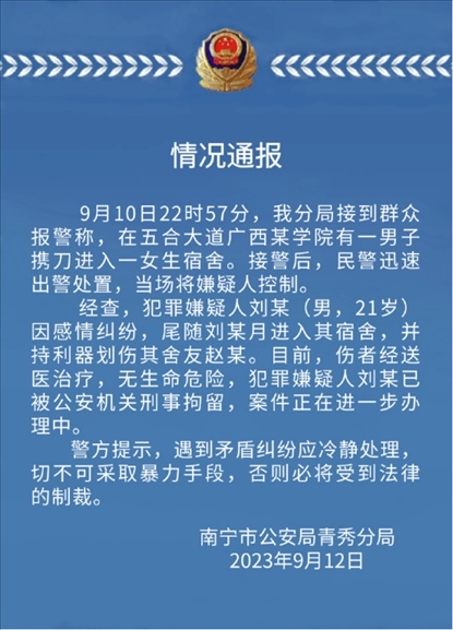 ·廣西外國語學(xué)院發(fā)生持刀傷人事件,警方通報(bào):進(jìn)女寢持刀傷人男生已被刑拘。
