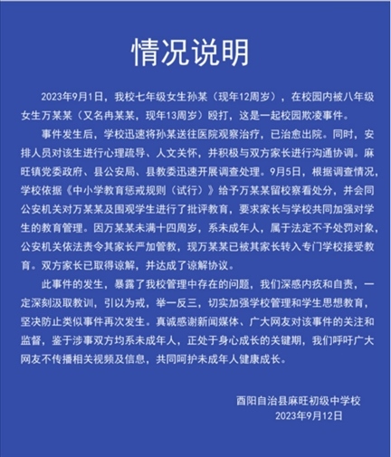 ·重慶酉陽初中女生遭欺凌事件進(jìn)展:雙方達(dá)成諒解協(xié)議,打人者已被轉(zhuǎn)入專門學(xué)校接受教育。