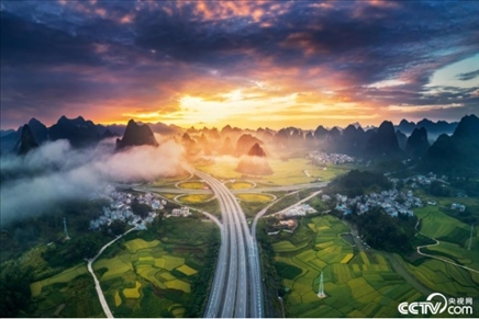2023年9月10日,廣西百色,日出時(shí)分,航拍合那高速靖西市舊州互通立交橋,連綿起伏的群山云霧繚繞,霞光照耀大地。