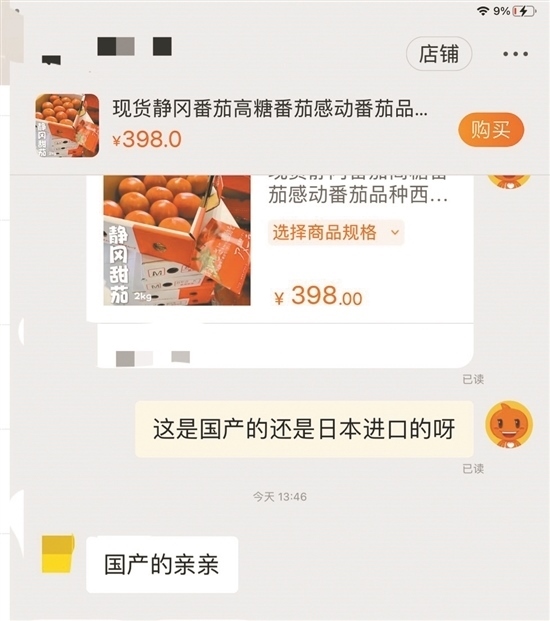 隨后,記者隨機(jī)在電商平臺(tái)選擇三款標(biāo)明是“進(jìn)口水果”的產(chǎn)品進(jìn)行詢問,結(jié)果對(duì)方均表示自己的水果是“國(guó)產(chǎn)的”。當(dāng)記者詢問一電商客服,標(biāo)價(jià)398元兩斤的“現(xiàn)貨靜岡番茄”和標(biāo)價(jià)178元一斤的日本淡雪白草莓是哪里產(chǎn)的時(shí),對(duì)方回答“親親,國(guó)產(chǎn)的”。