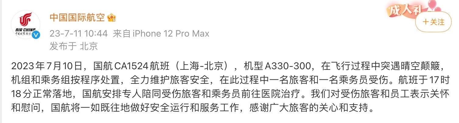 7月11日,中國(guó)國(guó)際航空在其官方微博發(fā)布通報(bào):2023年7月10日,國(guó)航CA1524航班(上海-北京),機(jī)型A330-300,在飛行過程中突遇晴空顛簸,機(jī)組和乘務(wù)組按程序處置,全力維護(hù)旅客安全,在此過程中一名旅客和一名乘務(wù)員受傷。航班于17時(shí)18分正常落地,國(guó)航安排專人陪同受傷旅客和乘務(wù)員前往醫(yī)院治療。