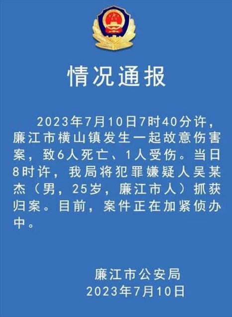 ·廣東廉江發(fā)生一起故意傷害案致6死1傷,25歲嫌犯已被抓獲,案件正在加緊偵辦中。