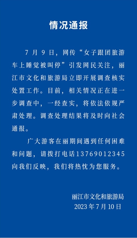 ·女子跟團游車上睡覺被叫醒不許睡?麗江文旅局:立即調查。