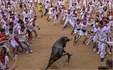 當?shù)貢r間2023年7月10日,西班牙潘普洛納,圣費爾明節(jié)期間,狂歡者站在公牛周圍,公牛進入斗牛場。