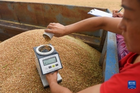 7月10日,在石嘴山市平羅縣姚伏鎮(zhèn),農(nóng)業(yè)工作者對(duì)小麥進(jìn)行水分測(cè)量。