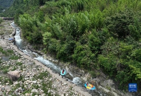 7月11日,人們?cè)诤贾菖R安龍崗鎮(zhèn)浙西大龍灣體驗(yàn)峽谷漂流(無(wú)人機(jī)照片)。