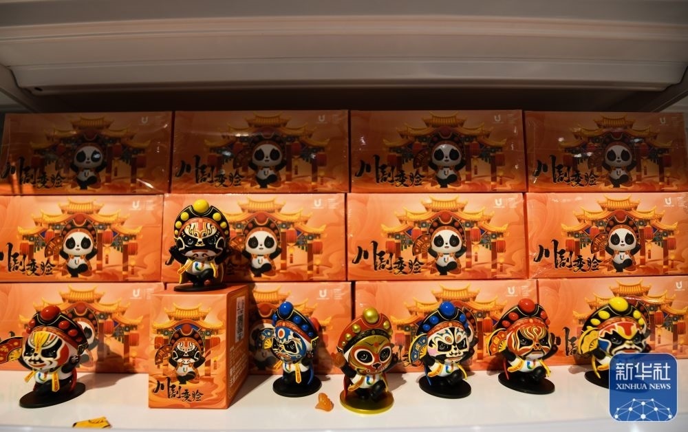 ↑這是7月13日拍攝的成都大運(yùn)會(huì)主媒體中心大運(yùn)會(huì)官方特許商品零售店展出的“蓉寶”川劇變臉造型玩偶。新華社記者 王曦 攝