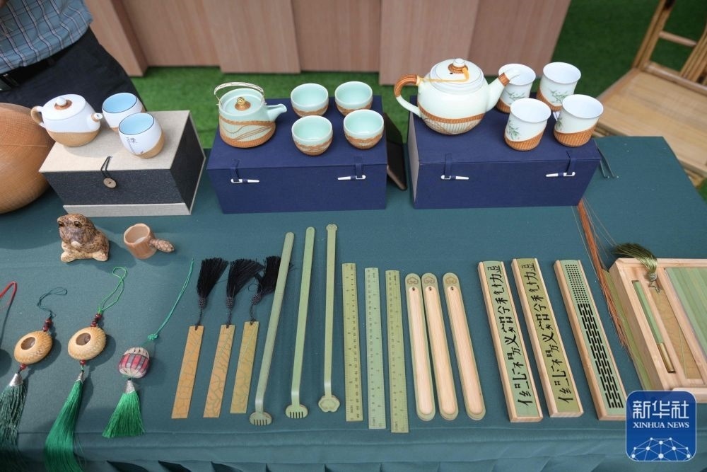 ↑?這是7月12日拍攝的主媒體中心傳統(tǒng)文化傳播區(qū)的四川竹編產(chǎn)品展示。新華社發(fā)(魏麟瀟攝)