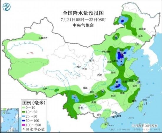 預(yù)計(jì),7月21日08時(shí)至22日08時(shí),內(nèi)蒙古東北部、河北東部、北京、天津、山東西北部、河南東南部、湖北東部、江西北部、四川南部等地部分地區(qū)有大到暴雨,其中,河北中部、北京東南部、天津南部等地局地有大暴雨(100~130毫米)。上述部分地區(qū)伴有短時(shí)強(qiáng)降水(最大小時(shí)降雨量20~50毫米,局地可超過60毫米),局地有雷暴大風(fēng)等強(qiáng)對(duì)流天氣。中央氣象臺(tái)7月21日06時(shí)繼續(xù)發(fā)布暴雨藍(lán)色預(yù)警。