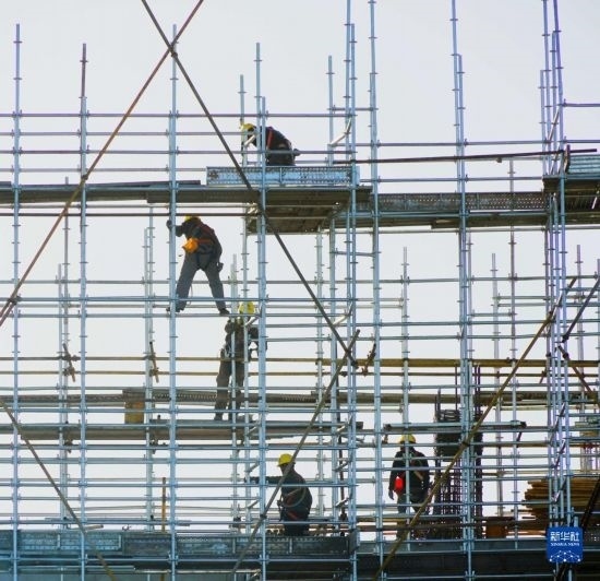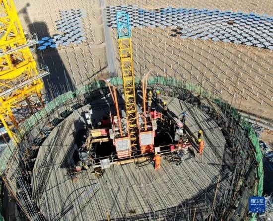 7月21日,在阿克塞千萬(wàn)千瓦級(jí)可再生能源多能互補(bǔ)基地,工人在匯東新能源75萬(wàn)千瓦光熱+項(xiàng)目建設(shè)現(xiàn)場(chǎng)施工。新華社發(fā)(馬曉偉 攝)