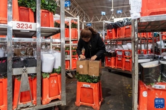 一名工作人員在昆明國際花卉拍賣交易中心內對臺車上存放的鮮花進行掃碼(7月13日攝)。新華社記者 陳欣波 攝