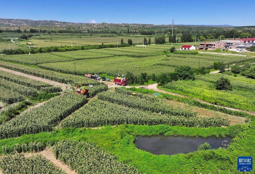 8月13日,在張家口市萬全區(qū)盆窯村鮮食玉米種植基地,農(nóng)民收獲鮮食玉米(無人機照片)。