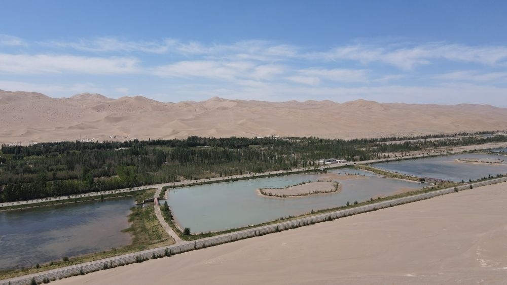 在距離月牙泉5公里的地方,有一處人稱“十二連湖”的景觀。十二個(gè)人工水池宛若明鏡,倒映藍(lán)天,時(shí)有水鳥掠過。