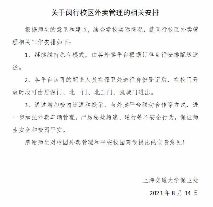 8月14日晚6點(diǎn),有上海交大學(xué)生向記者反映,學(xué)校已更新關(guān)于閔行校區(qū)外賣(mài)管理的相關(guān)安排。安排顯示,維持原有模式,由各外賣(mài)平臺(tái)根據(jù)訂單自行安排配送途徑,各平臺(tái)認(rèn)可的配送人員在保衛(wèi)處進(jìn)行身份登記后,在校門(mén)開(kāi)放時(shí)段可由學(xué)校四個(gè)校門(mén)進(jìn)出;學(xué)校會(huì)通過(guò)增加校內(nèi)巡邏和提示,與外賣(mài)平臺(tái)聯(lián)動(dòng)合作等方式,進(jìn)一步加強(qiáng)外賣(mài)車(chē)輛管理,嚴(yán)厲懲處超速、逆行等不安全行為,保證師生安全和校園平安。當(dāng)晚,澎湃新聞記者了解到,閔行校區(qū)已有保安人員接到上級(jí)通知,維持原有模式,多名外賣(mài)騎手也從學(xué)校保安人員處獲知可正常進(jìn)出校園。