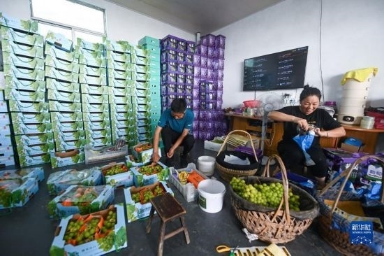8月20日,在諸暨市姚江鎮(zhèn)紫草塢村阿群家庭農(nóng)場內(nèi),種植戶打包成熟的葡萄,準(zhǔn)備運(yùn)往市場。
