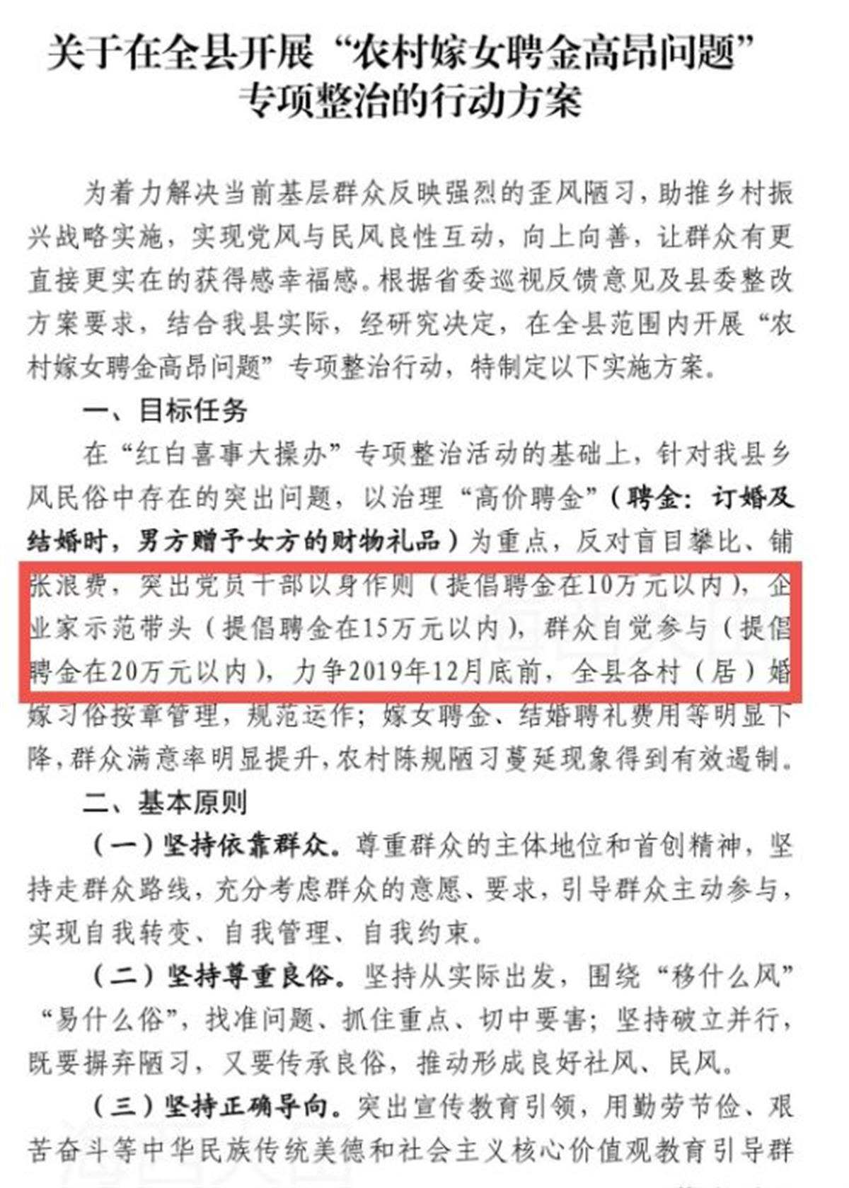 2019年5月,大田縣委辦公室就印發(fā)《關于在全縣開展“農(nóng)村嫁女聘金高昂問題”專項整治的行動方案》的通知。方案內(nèi)容有,針對該縣鄉(xiāng)風民俗中存在的突出問題,以治理“高價聘金”為重點,反對盲目攀比、鋪張浪費,突出黨員干部以身作則(提倡聘金在10萬元以內(nèi)),企業(yè)家示范帶頭(提倡聘金在15萬元以內(nèi)),群眾自覺參與(提倡聘金在20萬元以內(nèi)),力爭在2019年12月底前,結(jié)婚聘禮費用等明顯下降。