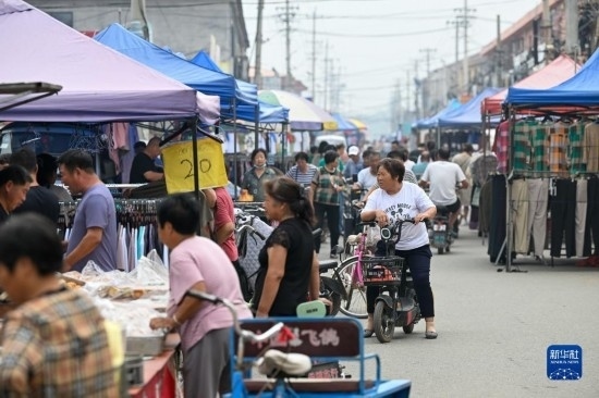 8月25日,在天津市靜海區(qū)臺(tái)頭鎮(zhèn),前來趕集的村民在大集上挑選商品。