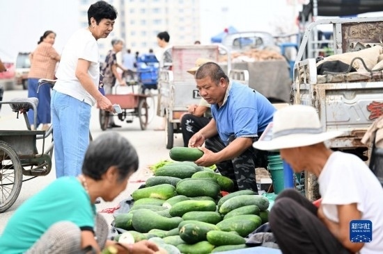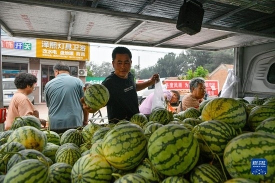 8月25日,在天津市靜海區(qū)臺(tái)頭鎮(zhèn),商戶為前來趕集的村民挑選臺(tái)頭西瓜。