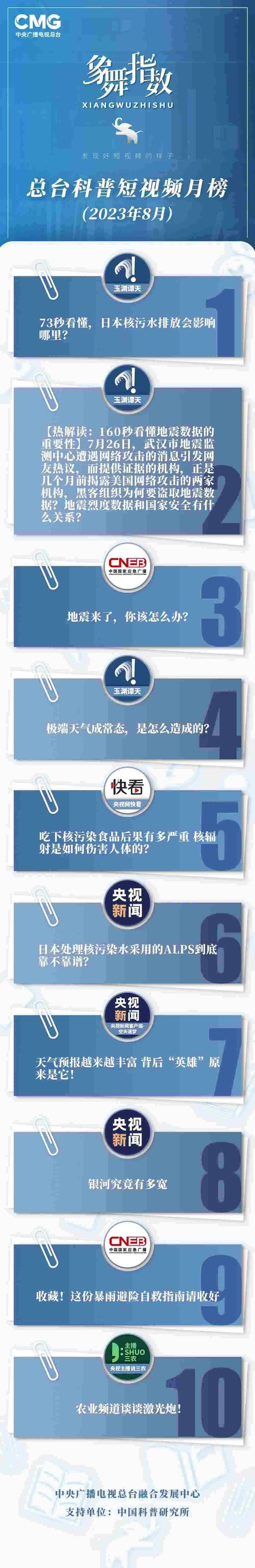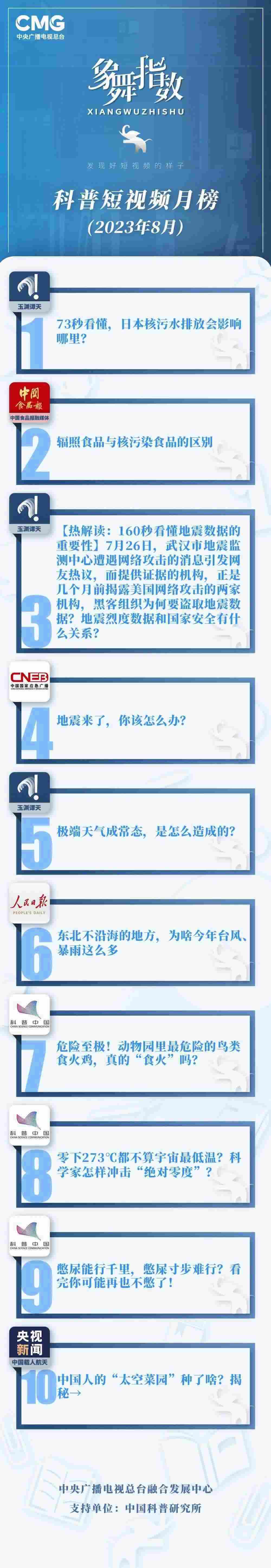 中央廣播電視總臺(tái)“象舞指數(shù)”評(píng)議品牌,推出科普短視頻月榜、總臺(tái)科普短視頻月榜。在2023年8月,值得注目的內(nèi)容有: