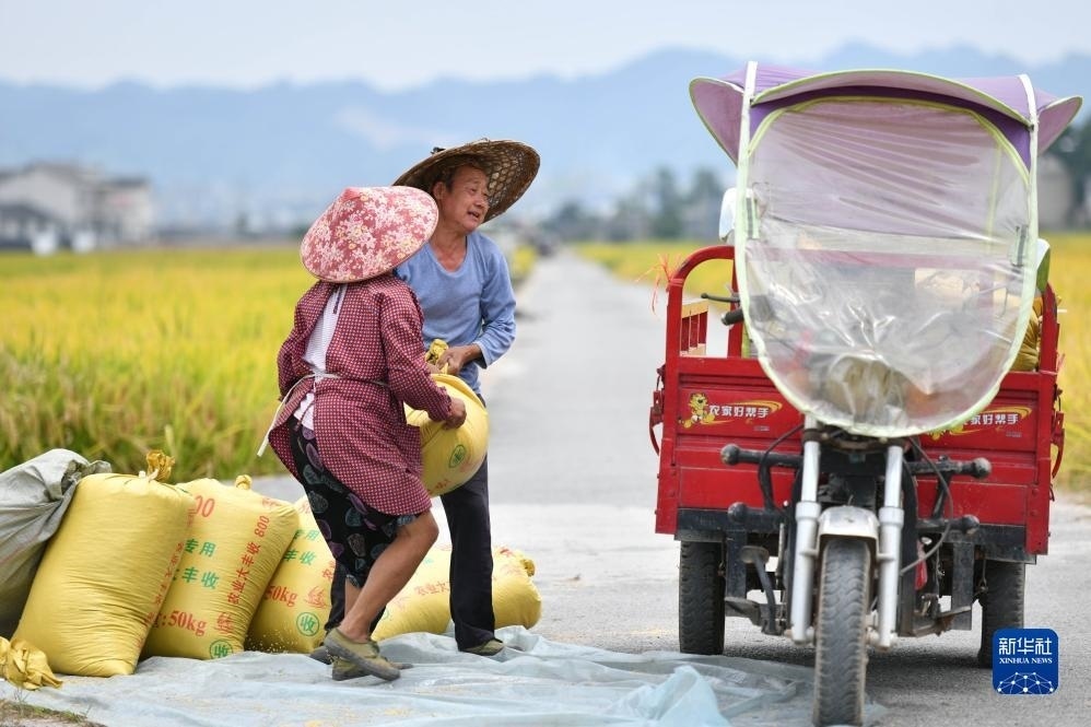 9月6日,村民在貴州省黔東南苗族侗族自治州黃平縣舊州鎮(zhèn)萬畝大壩搬運剛收獲的稻谷。
