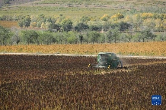 10月1日,在沽源縣白土窯鄉(xiāng)小西溝村,當(dāng)?shù)剞r(nóng)機(jī)手在操作收割機(jī)收獲藜麥。