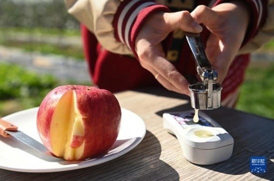 10月20日,西北農(nóng)林科技大學(xué)科研人員在洛川蘋(píng)果試驗(yàn)站檢測(cè)蘋(píng)果品質(zhì)。