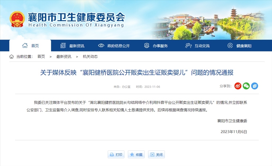 ·醫(yī)院院長(zhǎng)被舉報(bào)涉嫌販賣(mài)出生證,襄陽(yáng)衛(wèi)健委通報(bào):聯(lián)系公安部門(mén)、衛(wèi)生監(jiān)督局介入調(diào)查,同時(shí)安排專人聯(lián)系相關(guān)知情人士懇請(qǐng)?zhí)峁┲С?。后續(xù)將根據(jù)調(diào)查情況持續(xù)通報(bào)。