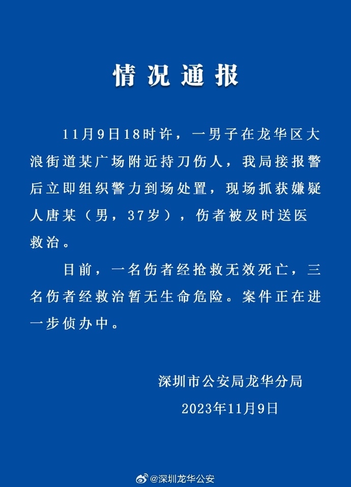 ·深圳警方:一男子在廣場(chǎng)持刀傷人致1死3傷,嫌犯已被捕。