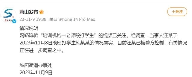 ·杭州蕭山通報(bào)“培訓(xùn)機(jī)構(gòu)一老師毆打?qū)W生”:屬實(shí),打人者已被警方控制。