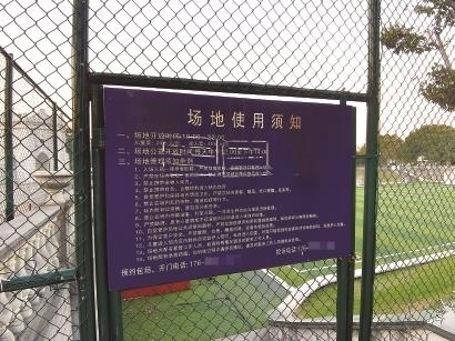 賢園足球場的“場地使用須知”牌。從上面羅列的條款得知,該球場僅中午12時至下午2時是公益免費開放時段。?