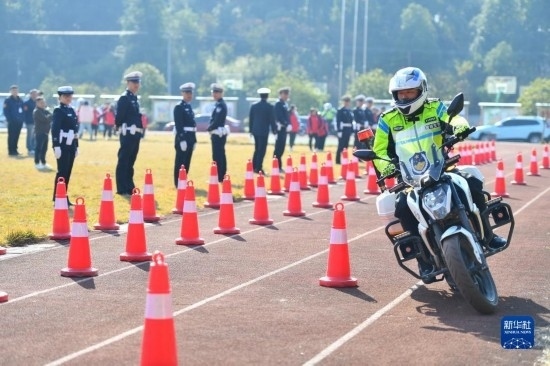 12月1日,在長沙市望城區(qū)新河學(xué)校,長沙市公安局望城分局交警大隊的鐵騎隊員進(jìn)行技能展示。